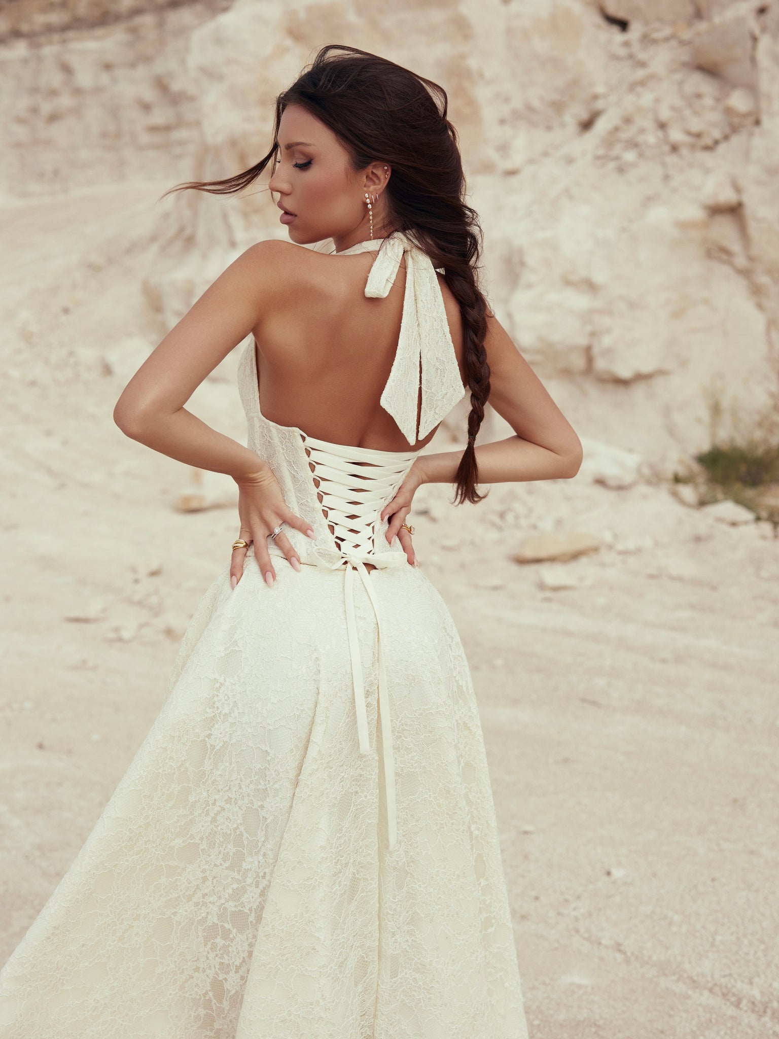 A romantic fusion of structure and softness, this halter-neck corset dress is crafted from exquisite Japanese lace, renowned for its delicate texture and exceptional quality. The bodice features a boned corset construction with lace-up detailing at the front and back, sculpting the waist and enhancing the feminine silhouette.