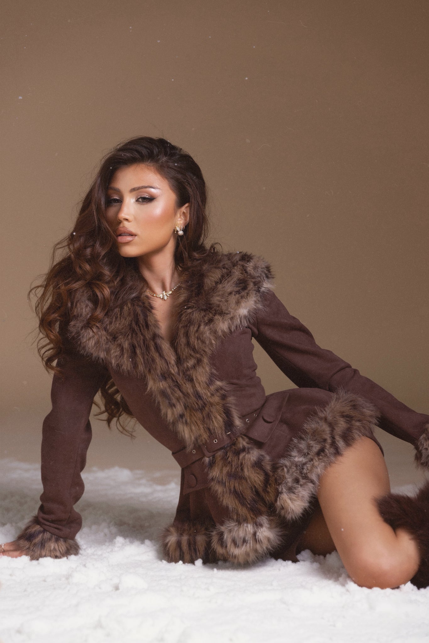 - Luxurious faux fur trim on collar, cuffs, hem, and skirt